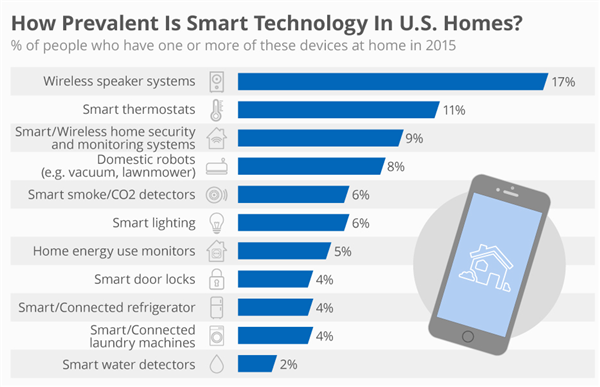 例如, 17%的Harris民意調(diào)查受訪者擁有無線揚聲器系統(tǒng),11%有智能恒溫器。約8%有家用機器人(可能是Roomba),6%有智能照明,9%有智能安全監(jiān)控系統(tǒng)。有趣的是,34%的受訪者家里有至少一個智能設(shè)備,千禧一代(1984-1995年出生)中比例上升到38%, 早期使用者上升到59%。