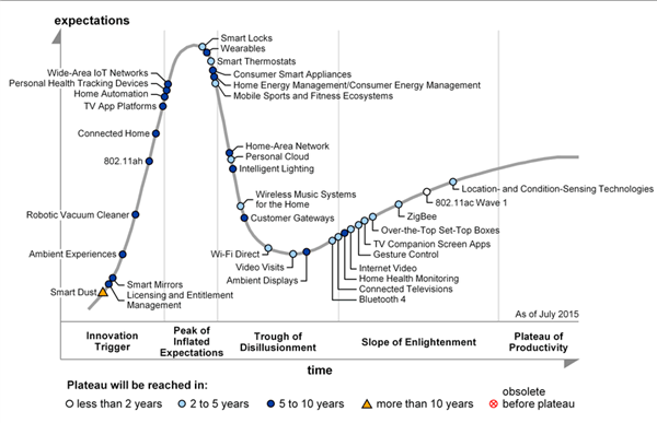 例如,Gartner的2015 Hype Cycle for Connected Homes顯示科技公司和應(yīng)用程序開發(fā)商向消費者推送的很多設(shè)備都處在期望膨脹期, 盡管至少智能家居自身等待著激發(fā)創(chuàng)新。這里的關(guān)鍵詞是大肆宣傳。