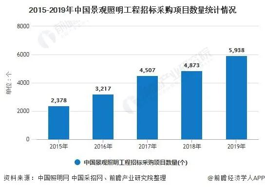 根據(jù)中國(guó)照明網(wǎng)和中國(guó)采招網(wǎng)的統(tǒng)計(jì)數(shù)據(jù),景觀照明工程招標(biāo)信息從2015年的2378個(gè)增加至2018年的4873個(gè),呈現(xiàn)逐年增長(zhǎng)趨勢(shì)。2019年行業(yè)項(xiàng)目數(shù)量還在進(jìn)一步增長(zhǎng),項(xiàng)目數(shù)量達(dá)到約5938個(gè)左右。