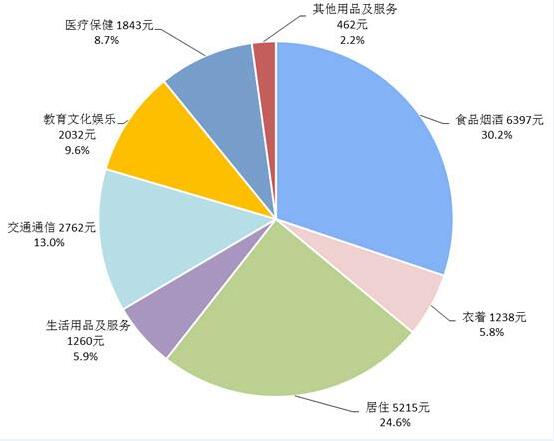 居民消費支出包括食品煙酒、衣著、居住、生活用品及服務、交通通信、教育文化娛樂、醫(yī)療保健以及其他用品及服務八大類。