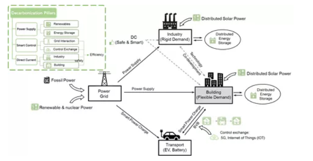 建筑、工業、交通電氣化加速過程中,技術的進步會打破各自的領域邊界,實現跨學科、跨領域協同發展。建筑與交通之間,城市內客運、城市間客運甚至貨運都呈現出較強的電氣化趨勢,一方面電池技術的進步和成本的下降會促進分布式儲能在建筑終端的普及應用;另一方面電動車本身的儲能通過雙向變換有可能成為建筑分布式儲能的有機組成部分(BVB)。建筑與工業之間,一方面傳統高耗能行業伴隨經濟結構調整和大宗物資的循環利用,電能替代和利用直流控制具有廣闊的空間;另一方面高端制造業將在材料科學、應用科學方面為直流在建筑中應用和智慧化奠定很好的基礎。此外,分布式光伏建筑應用將成為太陽能光伏應用的主戰場,建筑直流化發展也與照明、智慧終端、數據中心等產業發展密切關聯。通過建筑、工業、交通的綜合解決方案,推動城市能源結構轉型,對減緩電力供應峰谷差和溫室氣體排放將起到至關重要的作用。