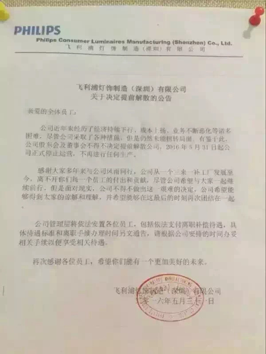 5月31日,業內出現一則關于飛利浦燈飾制造(深圳)有限公司決定提前提前解散公司的公告。