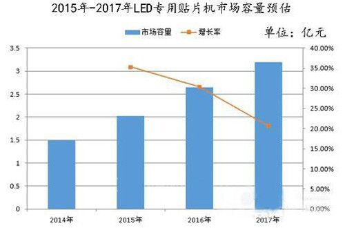 經過20多年的發展,我國每年對貼片機的需求量都有15-20%的速度遞增,從貼片機的保有量上來看,中國已經成為全球擁有貼片機數量最多的國家,也是全球最大,最重要的貼片機市場。據估測,在LED專用貼片機領域,2014年市場容量在1000臺以上。而2016年國內對貼片機的需求量新增約3000臺左右,其中用于LED專用貼片機的需求量約為1300臺。另外,考慮到LED燈具和LED顯示屏市場的顯著增長,2017年LED專用貼片市場容量將達到3.19億元,未來三年LED專用貼片機市場復合增長率將接近30%。