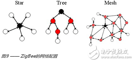 zigbee 網絡的實施有三種拓撲,如圖 9 所示。與 802.15.4 類似,zigbee 支持對等通信與星型配置。zigbee 在 802.15.4 規范之上添加了路由協議與層級網絡尋址方案,可實現群集樹拓撲結構(具有相同PAN ID)以及多跳網狀網絡拓撲。