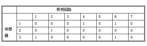 上表表示節(jié)點(diǎn)的各個(gè)智能照明模塊回路與系統(tǒng)中某一節(jié)點(diǎn)的的傳感器(包括本節(jié)點(diǎn))的互連關(guān)系。如果表項(xiàng)中對(duì)應(yīng)值為1,則表示對(duì)應(yīng)的照明回路與傳感器相關(guān)聯(lián),一旦傳感器有信號(hào),相關(guān)的照明回路就會(huì)被打開(kāi)。關(guān)系表中的各項(xiàng)的值可以隨時(shí)改變,并通過(guò)上位機(jī)或串口重新下載到存儲(chǔ)器中。