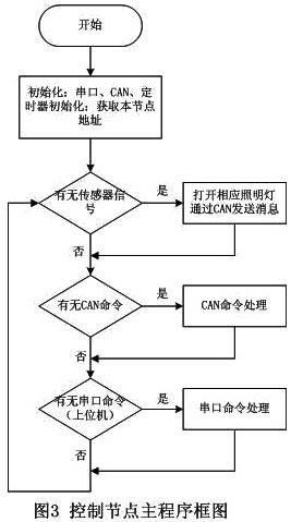 在系統(tǒng)初始化后,程序循環(huán)查詢傳感器接口、串口和CAN接口。當(dāng)檢測(cè)到傳感器有信號(hào)輸出時(shí),程序在打開(kāi)附近的照明回路的同時(shí)也通過(guò)CAN總線向其他節(jié)點(diǎn)發(fā)送該傳感器的信息。其余的控制節(jié)點(diǎn)一旦接收到該信息,便會(huì)查詢存儲(chǔ)在外部存儲(chǔ)器中的控制方案信息,然后打開(kāi)與該傳感器相關(guān)聯(lián)的照明回路,從而實(shí)現(xiàn)控制方案指定的照明方式。