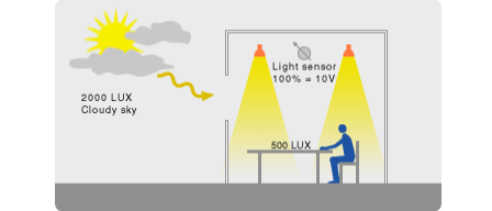 舉例來說,房間內的工作面上可以放置一個光傳感器。它會測量出總的光強度,包括了天然光和人造光。用戶可以輸入一個設定點的值。